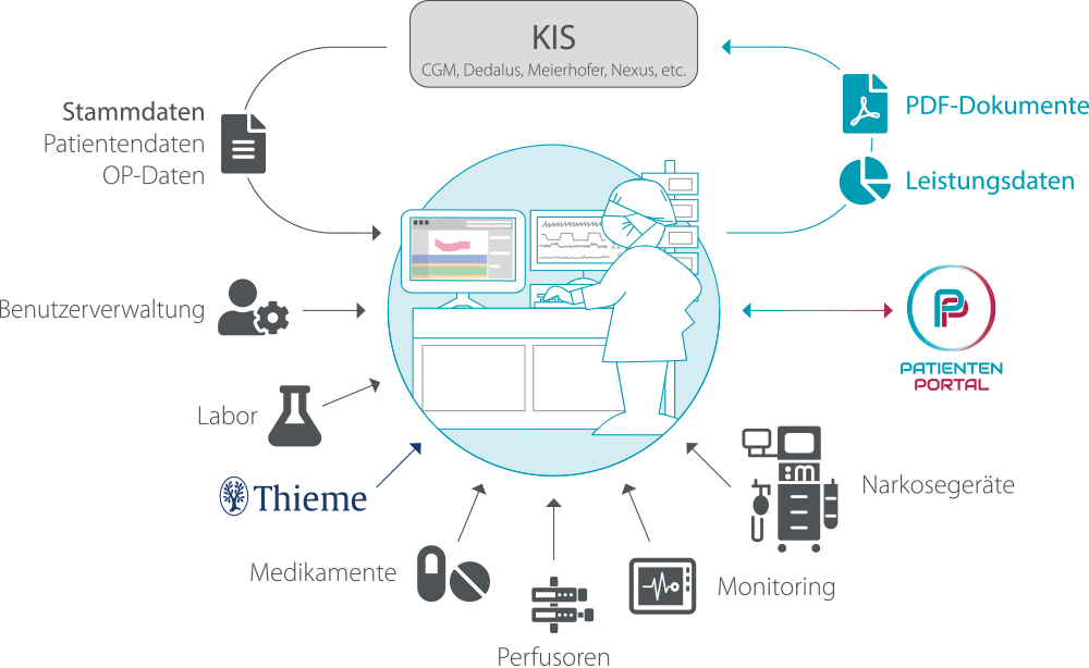Die Anästhesie Online Software lässt sich in bestehende Systemlandschaften integrieren.